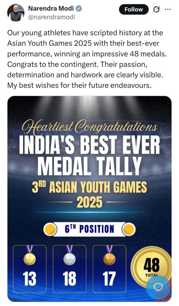 “Our young athletes have scripted history at the Asian Youth Games 2025 with their best-ever performance, winning an impressive 48 medals. Congrats to the contingent. Their passion, determination, and hard work are clearly visible. My best wishes for their future endeavours.”