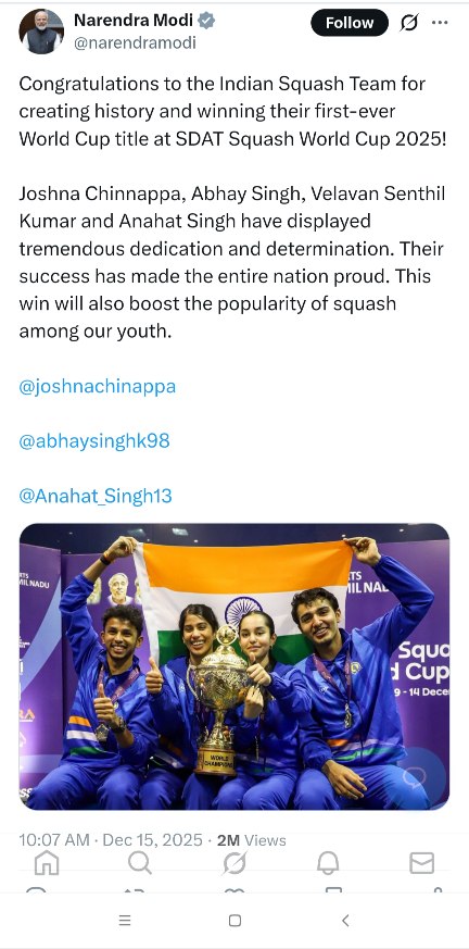 In his message, the Prime Minister praised Joshna Chinnappa, Abhay Singh, Velavan Senthil Kumar, and Anahat Singh for their remarkable dedication and determination, calling their achievement a moment of immense pride for the nation.